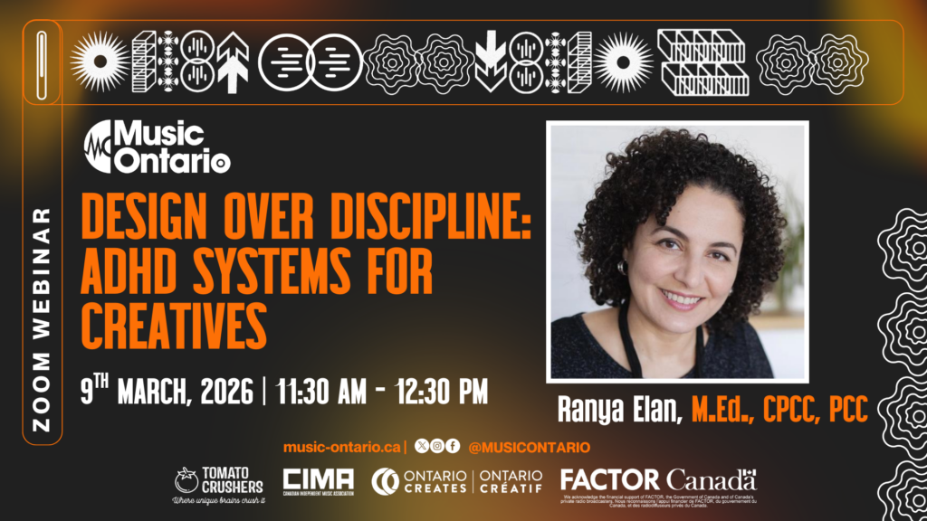 MusicOntario invites you to join their three-part webinar series designed to support artists and music professionals at every stage of their careers. From building ADHD-friendly systems to creating a healthier relationship with social media to understanding the legal foundations of your music, this series offers practical tools you can put into action right away.